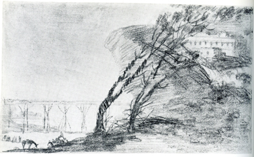 -Paisaje con peñasco, edificios y árboles (dibujo) (Antes de 1812)