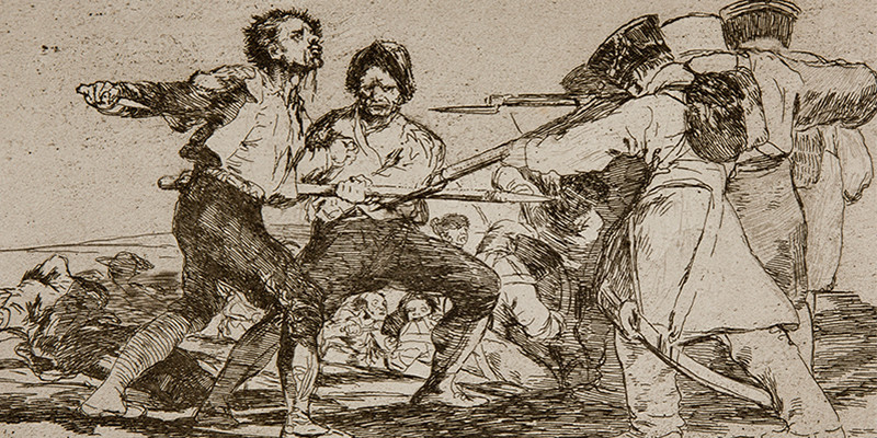 Detalle de la estampa "Con razón o sin ella" (Goya, 1810-1814), perteneciente a la serie "Los desastres de la guerra".El horror de la guerra y la historia del toreo español contadas por Goya, es decir, Los desastres de la guerra y La Tauromaquia. Estas son dos de las series más emblemáticas de Goya, que podrán visitarse en la provincia argentina de Mendoza durante los próximos meses. Del 6 de febrero al 5 de abril, se expondrán 82 obras de la serie Los desastres de la guerra en el Espacio Cultural Julio Le Parc (Guaymallén). Casi simultáneamente, del 7 de febrero al 6 de abril, en el Centro de Congresos y Exposiciones Alfredo Bufano (San Rafael), serán expuestos 33 cuadros de la serie La tauromaquia.