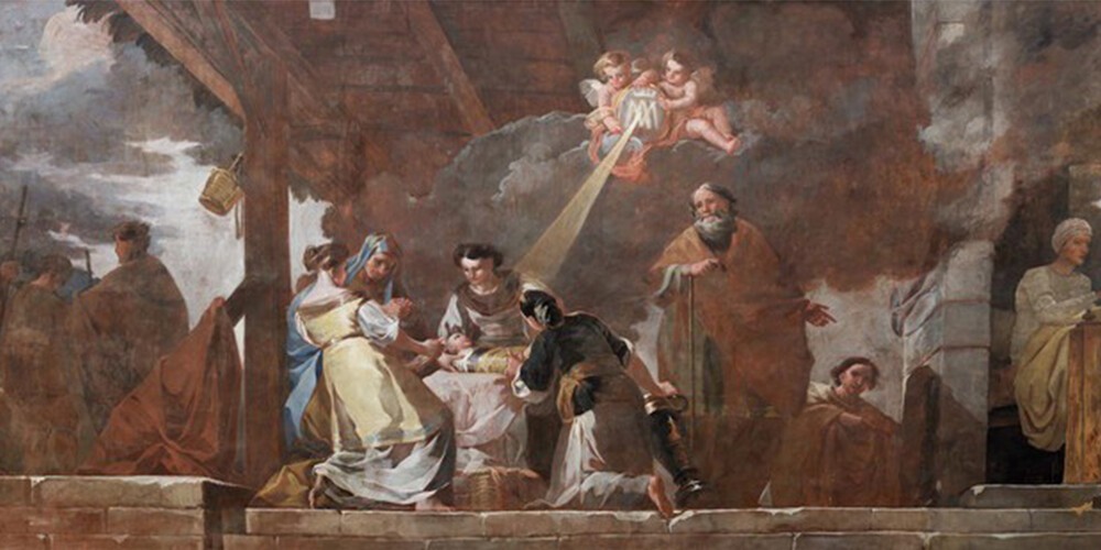 Detalle de "El nacimiento de la Virgen" (Goya, ca. 1774), perteneciente a las pinturas murales de la Cartuja de Aula Dei dedicadas a la Vida de la Virgen.