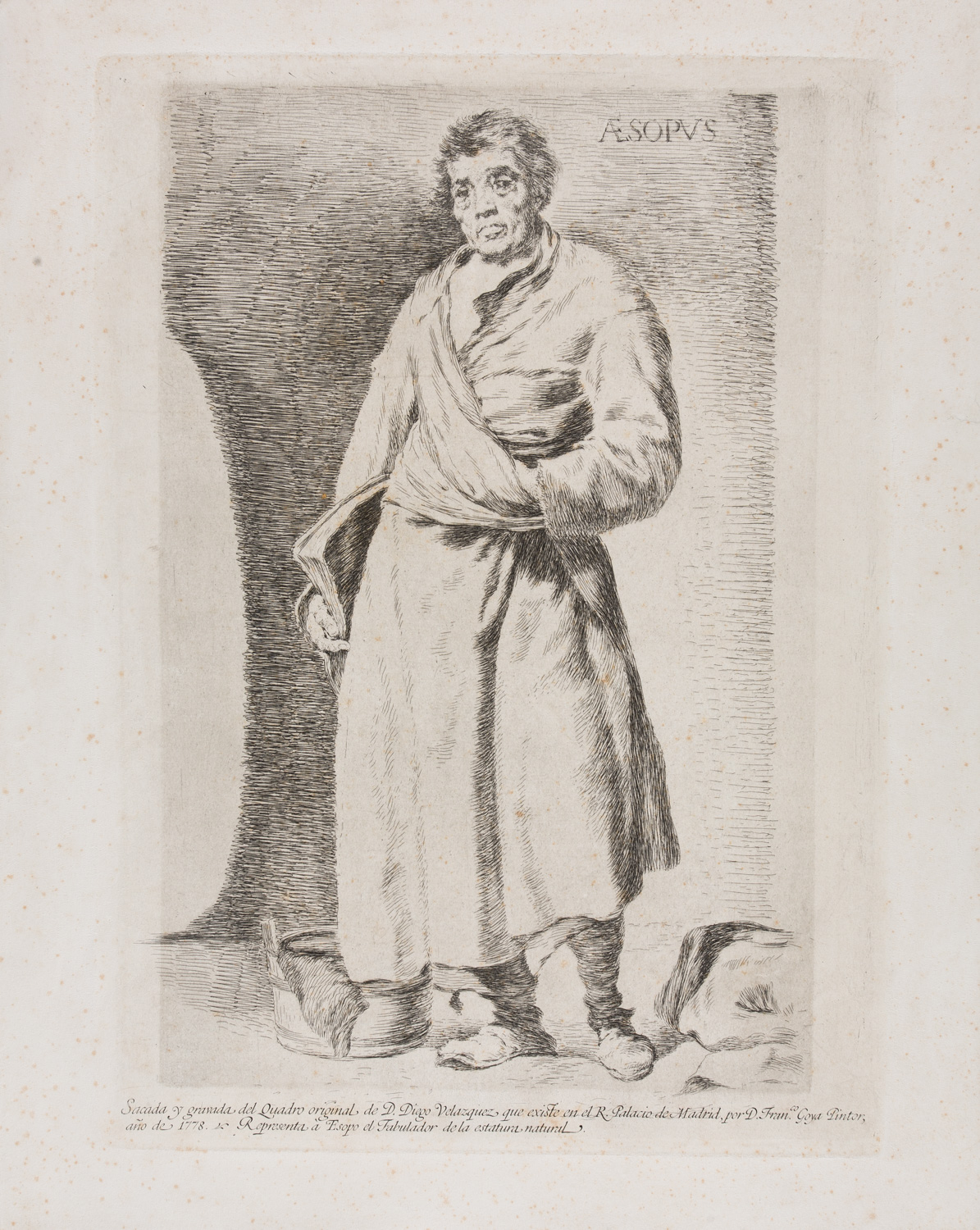 La estampa ejecutada por Goya se enmarcaba dentro de un proyecto, que contaba con el apoyo del conde de Floridablanca, cuyo objetivo era grabar las obras de arte más destacadas de los palacios reales y otras colecciones notables y de este modo difundir los tesoros artísticos españoles. Se conocen diecisiete copias al aguafuerte de obras de Velázquez que Goya realizó entre 1778 y 1779, cuando iniciaba su andadura como pintor de la corte, y que pudo ver en la Colección Real. El Museo de Zaragoza cuenta entre sus fondos con algunas de estas estampas: Felipe III, Margarita de Austria, Sebastiano de Mora y Menipo. El grabado de Esopo viene a aumentar la colección.