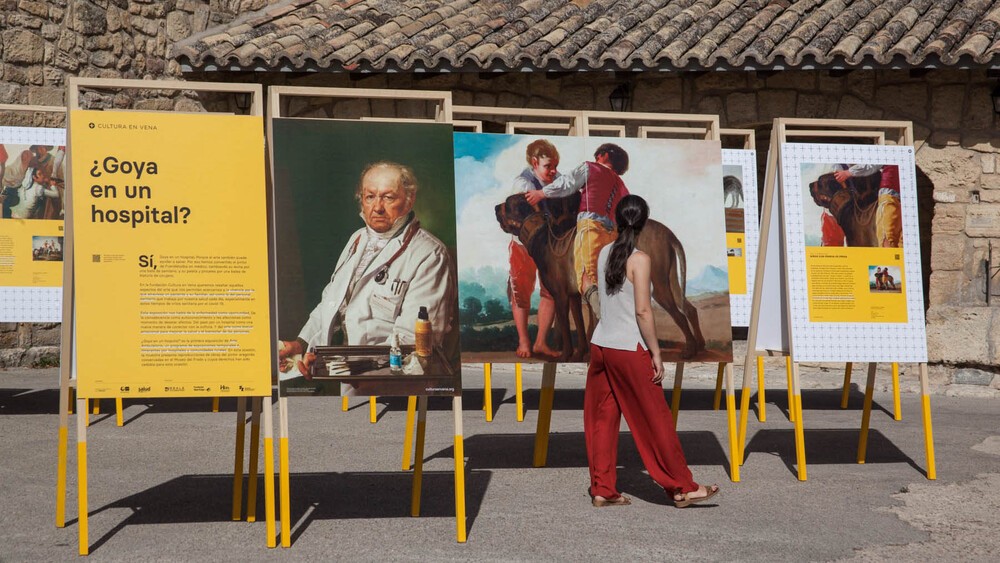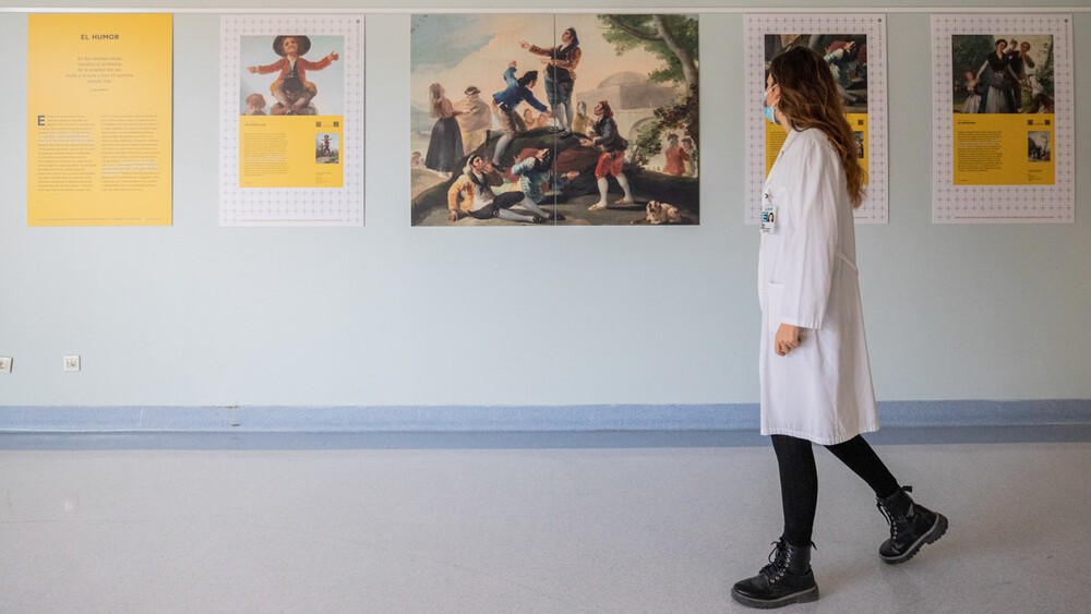 Dentro del programa Arte Ambulatorio, “¿Goya en un hospital?” presenta de forma innovadora una selección de reproducciones de los cartones que el genio aragonés pintó para la Real Fábrica de Tapices y que han sido cedidas a la fundación por el Museo Nacional del Prado. Estas imágenes muestran escenas jocosas y agradables y van asociadas a textos que pretenden conectar con las vivencias de los pacientes, sus familiares y el personal de los centros sanitarios. Obras como Las gigantillas, La pradera de San Isidro, El pelele o La vendimia aparecen agrupadas en torno a los conceptos del humor, la contradicción, los retos y las emociones, ofreciendo múltiples lecturas e invitando al espectador a la reflexión. Además, para quien desee profundizar en el conocimiento de las obras, estas tienen asociado un código QR que da acceso al catálogo on line del Museo del Prado.