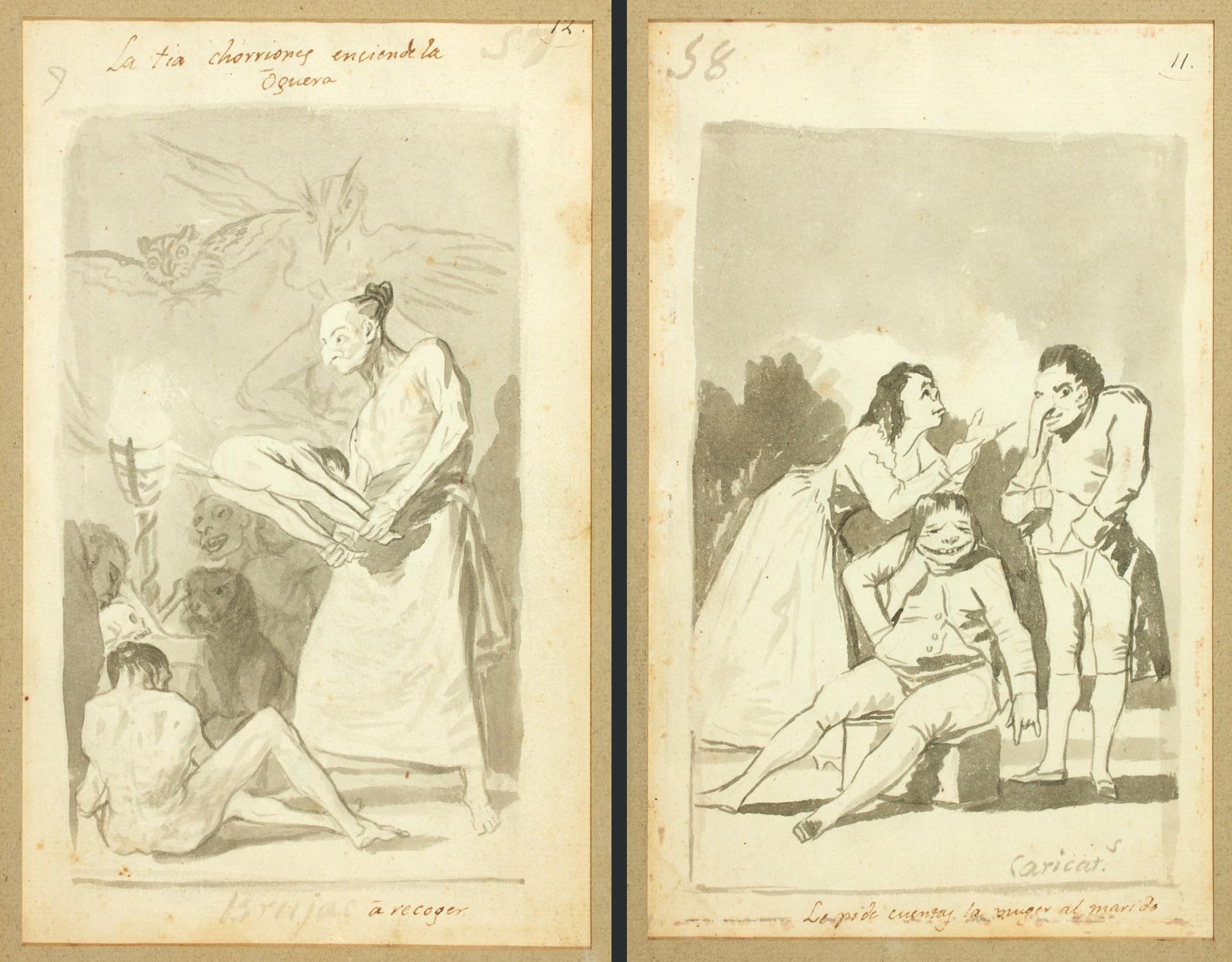 En una de las caras se representa La tía Chorriones enciende la hoguera, que dio lugar al Capricho 69 (Sopla). En el reverso, se muestra la escena grotesca Caricaturas. Le pide cuentas la mujer al marido.