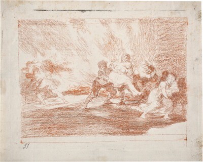 Enigmática escena de un hombre huyendo de las llamaradas y del humo provocadas por un incendio que amenaza con engullirlo. Un incendio del que, sin embargo, no vemos el resplandor. Al contrario, Goya ha construido un fondo sombrío sobre el que se recorta la figura iluminada del horrorizado protagonista, consiguiendo un efectivo claroscuro. Se subraya así el sentimiento de pánico que vemos en su rostro, y en el retórico gesto de las manos, que aparecen más perfiladas que el rostro; un miedo incontrolado que raya la locura y que también se observa en una escena de incendio que Goya ya había representado anteriormente, en el aguafuerte Desastre 41. Escapan entre las llamas.