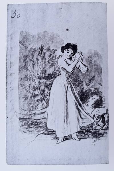 Ya en otras ocasiones había representado Goya la figura de una mujer de pie, retorciéndose las manos y con rostro desolado. En el dibujo Joven retorciéndose las manos ante un cuerpo desnudo (B.50), realizado unos veinte años antes, aparece una figura femenina con las manos en la misma posición llorando la muerte de su amado. En este dibujo del Cuaderno F se aprecia una mayor madurez, puesto que el cuerpo de la mujer no muestra la rigidez del anterior. Por otro lado, en el dibujo B.50 se ve claro el motivo del llanto de la joven, que es la muerte de su amado, tumbado en el suelo, algo que no ocurre en este caso pues, según Gassier, una mano posterior a Goya emborronó con tinta el fondo original, lo que impide una lectura completa del tema, que a tenor de ciertas plantas que se observan es de ambientación campestre.