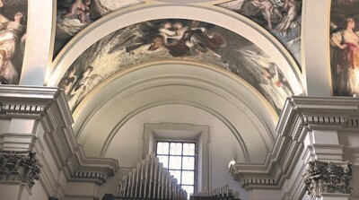 Los ángeles que rodean el símbolo divino también conservan la armonía de su agrupación, aunque en la obra definitiva se aumentara la escala y se trasladaran a un primer plano, para que el espacio quedara más lleno. Por otro lado, las figuras angelicales se agitaron y arremolinaron más, por lo que el ambiente y el ritmo del boceto se tornaron más enérgicos en la obra definitiva