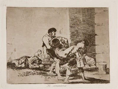 Los cambios que Goya ha introducido en el grabado con respecto al dibujo preparatorio se encuentran al fondo, en la izquierda del grabado. En el dibujo se puede ver una figura tumbada sobre un costado que se orienta hacia el fondo. En la estampa Goya ha optado por la representación de un cuerpo en la misma postura aunque mirando hacia el espectador. Asimismo, ha incluido en el grabado a una mujer que sujeta en sus brazos a un niño y que se ve en la lejanía, cuya presencia no se constata en el dibujo.
