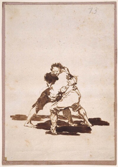 En este caso, el alguacil levanta enérgicamente la vara con la que se dispone a azotar a dos hombres enzarzados en una riña, quienes presentan ciertas similitudes con los del dibujo Dos hombres batiéndose (F.73), de este mismo Cuaderno F.