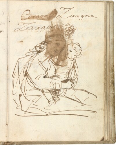 En el extremo superior de la página, a pluma, Goya anotó posteriormente, en enero de 1775, las fechas de su partida de Zaragoza con su familia para instalarse en Madrid (3 de enero) y de su llegada a la Corte (10 de enero). Dicha anotación la superpuso a un pequeño apunte a lápiz negro, en sentido transversal, de lo que parece ser una cabeza de un niño mirando hacia arriba (incluido parte de su hombro derecho), probablemente un angelito en gloria, más tarde descartada y tachada por el propio pintor con un trazo en zigzag también de lápiz negro.