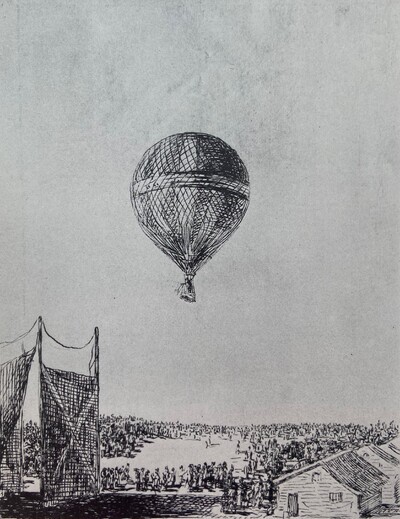 Este dibujo y otro realizado a pluma con temática similar, titulado Elevación aerostática, pudieron servir a Goya de modelos de referencia para elaborar un lienzo que actualmente se conserva en el Museo de Agen con el título de El globo. El pintor aragonés, que seguramente presenció la novedosa ascensión de uno de estos globos aerostáticos en el verano de 1792 en Madrid, muestra en este dibujo de grandes dimensiones una inmensa explanada llena de público que observa el vuelo de este invento de la Ilustración. Por el contrario, en el lienzo la gente no contempla el acontecimiento sino que corre bajo el globo proporcionando a esta obra de una cierta sensación de inquietud.