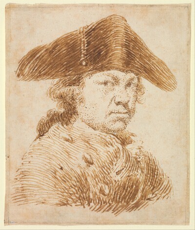 Joaquín María Ferrer, político liberal exiliado, y su esposa alojaron a Goya en París durante el verano de 1824, al comienzo de los cuatro años del exilio francés del pintor. Como muestra de agradecimiento, les hizo obsequio de este dibujo, en el que se autorretrató de perfil, a sus casi 79 años, con una gorra de visera. Numerosos trazos cortos a pluma sirven para sugerir las fibras de la tela del abrigo y la gorra, o el cabello ensortijado en la nuca, que deja visibles las orejas. La huella del tiempo se hace evidente en los párpados y las comisuras de la boca, que hacen un gesto entre despreciativo e irónico. Sin embargo, Julián Gállego, entre otros, afirma que este último autorretrato de Goya es una asombrosa afirmación de perenne juventud, por la actitud firme del rostro, por la mirada todavía viva y penetrante y, quizá, porque Goya se ha tocado con una gorra y no con un sombrero de copa. Representa así al joven viajero, apelativo con que lo llaman por esas fechas cariñosamente Leandro Fernández de Moratín y Manuel Silvela, sus amigos en el exilio bordelés. La historiografía coincide en interpretar el ánimo y carácter del Goya anciano a través de esta última imagen que construye sobre sí mismo: decidido, en alerta, nada acomodado en la vejez y abierto al cambio y al aprendizaje, ya sea experimentando con el procedimiento de la litografía o, forzado por las circunstancias, iniciando una nueva vida con su familia en una ciudad extranjera. El aspecto con que se presenta es, definitivamente, el de un hombre contemporáneo.