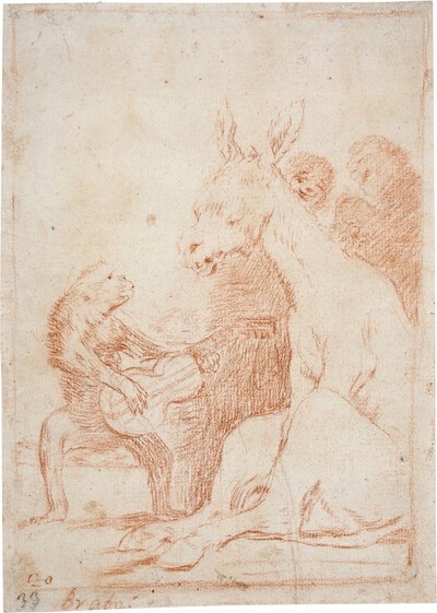 Un mono toca una guitarra que está al revés, es decir, por la parte en que no están las cuerdas. Frente a él se sienta un asno que le mira con expresión absorta, que parece estar deleitándose ante el recital que le ofrece la simia. Detrás advertimos la presencia de dos hombres que aplauden al tiempo que se ríen.