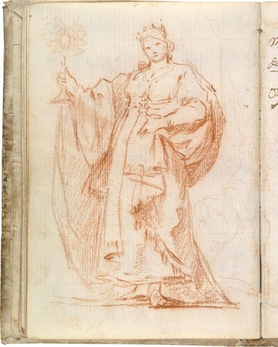 En su momento, Juliet Wilson-Bareau relacionó este dibujo con la cabeza de la escultura clásica Juno Cesi (siglo II a.C.) de los Museos Capitolinos de Roma, muy apreciada desde los tiempos de Miguel Ángel y que seguía siendo un modelo a seguir para los jóvenes artistas dieciochescos que se formaban en Roma. No obstante, según Manuel B. Mena, la cercanía parece mayor con la cabeza de otra escultura clásica romana, la colosal Ceres del Museo Pio Clementino, aunque la corona habría que relacionarla más bien con las que portan las figuras femeninas clásicas reflejadas en la pintura barroca clasicista romana del siglo XVII (Pietro da Cortona…). A su vez, Wilson-Bareau consideró el presente dibujo modelo para la temprana pintura goyesca de Santa Bárbara (ca. 1773), aunque variando el tipo de corona. Es probable que Goya, al concebir el futuro lienzo, optara por ensayar la inspiración clásica, que depuró en un segundo estudio, ya de cuerpo entero y muy cercano a la obra definitiva, contenido también en el Cuaderno italiano (p. 88).