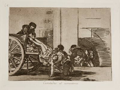 El grabado nº 64, Carretadas al cementerio, es el último que Goya dedica al tema del hambre que sacudió el país especialmente entre los años 1811 y 1812. Esta estampa se ajusta con gran fidelidad al trabajo realizado por el pintor aragonés en su dibujo preparatorio. Modifica ligeramente la postura del personaje que está en el fondo que, en el dibujo, se encuentra ligeramente ladeado y marca con fuerza la estructura arquitectónica del fondo que en el dibujo sólo se bosqueja.