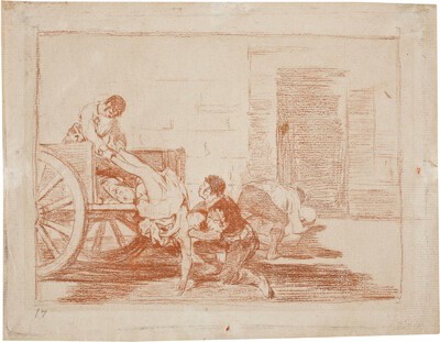 Dos hombres suben a un carro el cuerpo de una joven muerta; uno la sujeta por la espalda mientras que el otro agarra sus tobillos. La fuerza de las dos figuras masculinas y la manera en que suben el cuerpo al carro contrastan con la delicada anatomía de la joven que aún parece llena de vida, lo que podría indicar su reciente fallecimiento. Se disponen a depositarla sobre el amasijo de cadáveres que está sobre el carro y que, tal y como dice el título del grabado, será posteriormente conducido al cementerio. En la parte derecha de la estampa Goya ha grabado a un hombre de espaldas al espectador que se agacha para recoger otro cadáver que posteriormente también será depositado en el carro.