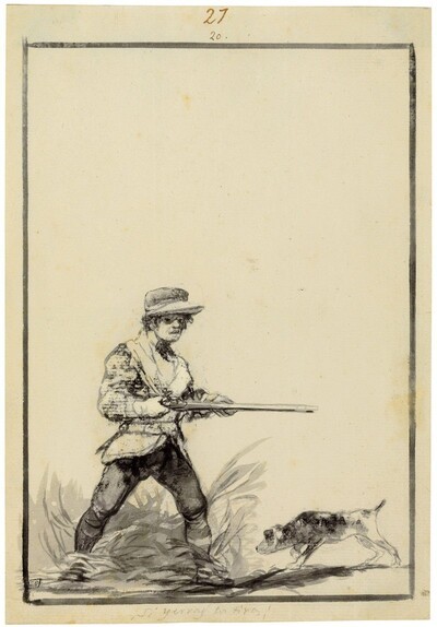 La obra se relaciona estrechamente con otros dos dibujos de caza con perro de Goya que muestran un momento de alerta similar: Cazador con su perro de muestra (F.100) y ¡Si yerras los tiros! (E.27).