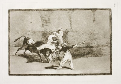 El dibujo preparatorio para la estampa Cogida de un moro estando en la plaza muestra una cogida, no exenta de comicidad por el inusual ropaje de los personajes.