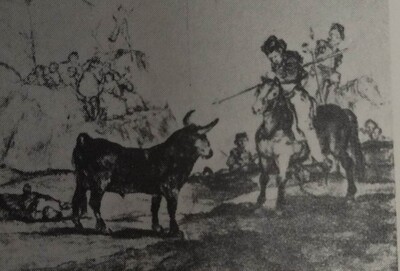 Quinta estampa que se considera integrante de "Los Toros de Burdeos", aunque fue desechada por el artista debido a su falta de calidad y podría tratarse de un primer ensayo. La firma, el lugar y la fecha escrita sobre la piedra recuerdan la costumbre de Goya de firmar y fechar los primeros cobres cada vez que comenzaba una nueva serie.