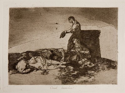 Cruel lástima! es el grabado que inaugura en la serie de Los Desastres de la guerra las estampas que se dedican al hambre que asoló España durante la Guerra de la Independencia. En el dibujo preparatorio de esta estampa se resuelven con detalle los cadáveres que yacen en primer término, mientras que la figura que está atrás y que extiende un sombrero pidiendo limosna es, en el dibujo, tan sólo una sombra. Goya determina, cuando realiza el grabado, aproximarla al espectador y representarla con mayor concreción. Además en el dibujo preparatorio el cielo es diáfano mientras que en la estampa se ha oscurecido en los ángulos.