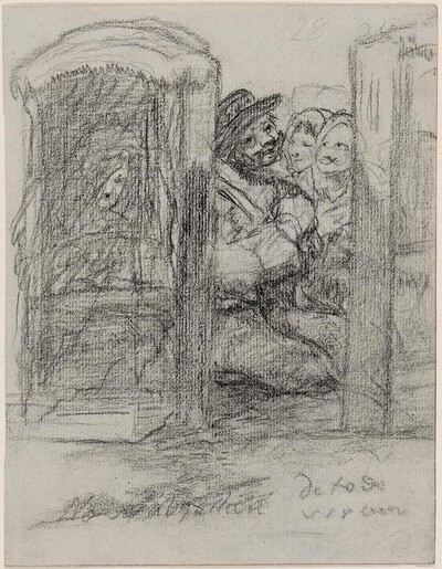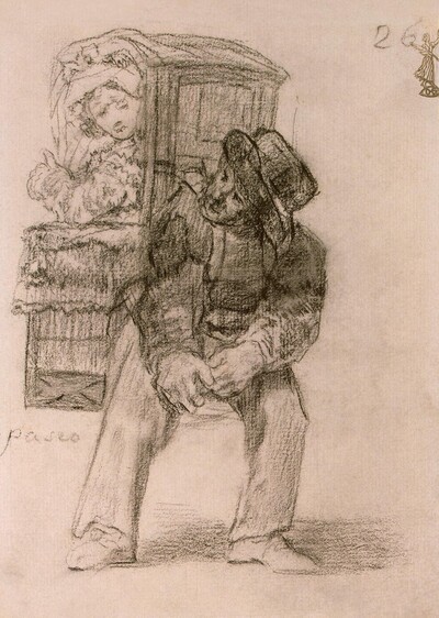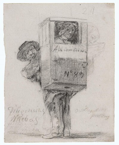 Se trata de uno de los dibujos del Cuaderno G de Burdeos en los que Goya representa curiosos medios de locomoción descubiertos durante sus estancias parisina y bordelesa. Cuatro de ellos corresponden a sillas de respaldo o de manos, un pintoresco medio de transporte consistente en una caja de gran tamaño con espacio para un solo pasajero y que llevaba un porteador sobre sus espaldas. En este dibujo observamos al conductor de una de estas sillas de manos, cuyo pasajero va oculto por una cortina que se ha echado y tiene sus bordes remetidos en la estructura. Encorvado por el peso, el conductor gira su rostro hacia su oculta carga, pudiendo leerse en su rostro cierto gesto de intriga. En un plano posterior, tras la línea del horizonte, se advierten los trazos de otra silla que se aleja. La representación de esta silla es algo más maliciosa que en el resto de escenas con sillas de manos, puesto que en todas ellas, Diligencias nuevas… (G.24), Paseo (G.26) y De todo sirven (G.28), las pasajeras, siempre tocadas con sombrero y de aspecto elegante, aparecían a la vista del espectador, sugiriendo que indicaban la dirección a la que debían conducirlas. Esta puesta en escena llevaba a algunos autores a plantear una interpretación del tema según las tensiones de clase social. Aquí, en cambio, Goya pone el énfasis en el carácter secreto del cliente o clienta, y lo refleja, con gran agudeza, en el gesto suspicaz del porteador. Al igual que en aquellas escenas, Goya reserva el fondo y apenas sugiere el espacio con la sombra proyectada por el personaje y su carga, cuyo modelado ha creado magistralmente con un delicado sombreado, que se acentúa en la espalda del protagonista con trazos más intensos del lápiz litográfico.