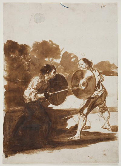 En este duelo Goya muestra el momento en el que uno de los personajes introduce con firmeza su espada en el pecho del contrincante, quien, ya herido de muerte, está a punto de desvanecerse vomitando sangre por la boca. Los combatientes van doblemente armados con una daga en la mano izquierda, de la cual también podían disponer en la contienda. La indumentaria, de finales del siglo XVI o principios del XVII, está compuesta por calzones y camisas con rizadas gorgueras en el cuello. Se trata de la escena de duelo más dura del Cuaderno F. Es la tercera de las seis que se incluyen en el referido cuaderno.