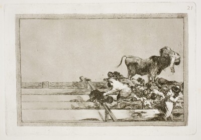 Finalmente, al resolver el grabado, Goya introducirá numerosas modificaciones en la composición respecto a lo contemplado en este estudio preparatorio. Así, todos los personajes que vemos a la izquierda serán sustituidos por las gradas vacías, concentrándose el público en la parte derecha, aunque eliminando el grupo existente detrás del toro, un toro que será prácticamente el único elemento del dibujo que se mantendrá sin apenas modificación en la estampa.