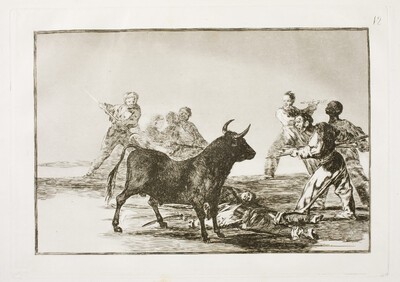 Para Gassier la intención de Goya está muy clara: quiere impresionar al espectador. Aquí solo aparece un personaje en el suelo, boca abajo, seguramente herido por el toro, que se encuentra en posición erguida, desafiante, aunque en el grabado su pelaje será más oscuro. Toda la gente que abarrota la escena pretende terminar de matar al astado, que ha sido herido previamente por un “caballero en plaza” que no ha llegado a terminar con él, labor que queda reservada a la canalla.