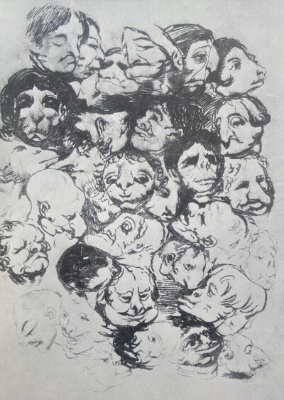 En este dibujo se muestran dieciséis caricaturas realizadas en una hoja que Goya dividió por la mitad, dibujando siete en un lado y nueve en el otro. Todas excepto una son rostros de hombres, rostros salidos de la imaginación desbordante de Goya y que tienen relación con algunas figuras de los Caprichos o del Cuaderno B. Arturo Ansón ha estudiado cada uno de estos rostros, que representan diferentes tipos de personajes. De izquierda a derecha y de arriba abajo nos encontramos con dos frailes gordos y viejos, con un funcionario real o catedrático de derecho enfadado y gritando, con un hombre gordo sonriendo burlonamente con boca grande y gruesos labios, y con otro hombre con rostro de simio, cabizbajo y mirada triste. A su lado un hombre barbudo, sin dientes, que une la barbilla con la nariz y cierra los ojos. Este tiene enfrente a un hombre de perfil con rostro sorprendido y que parece que olfatea algo. Le siguen un joven prepotente y fanfarrón, un aristócrata o burgués con nariz prominente, un anciano con la nariz aplastada, un joven con mirada desconfiada, un hombre mayor con rostro de conejo que parece estar rumiando algo, seguido de un personaje que Ansón compara con un eunuco del harén de un sultán, un carcelero o un levantador de pesas circense. El siguiente personaje tiene rostro de perro o de lobo con mirada penetrante y vestido de burgués. Las dos últimas caricaturas corresponden a una mujer de perfil con la nariz pegada al rostro y a un fraile narigón.