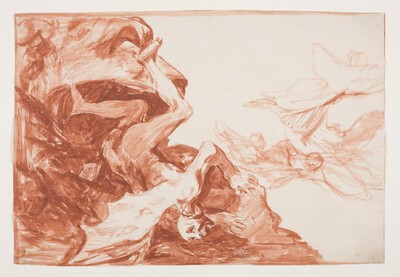El personaje principal de esta estampa se relaciona, en posición invertida, con el demonio en caída del dibujo preparatorio de un disparate no realizado titulado La desesperación de Satán.