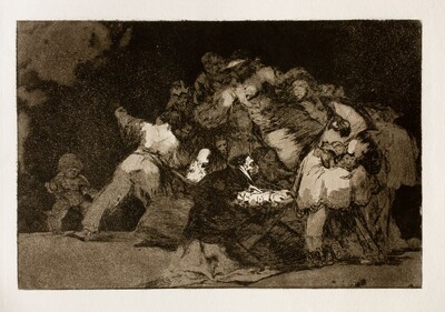 Aunque es difícil encontrar semejanza con la estampa, la vinculación viene de la confusa y amontonada composición conseguida con las manchas de aguada aplicadas en golpes instantáneos. La angustiosa y desconcertante masa del grabado se inicia en este dibujo preparatorio, en el que hay que adivinar las distintas figuras que lo componen.