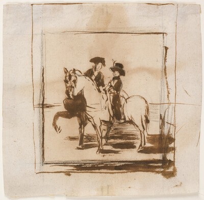 Este dibujo muestra un doble retrato ecuestre de Carlos IV y María Luisa de Parma. Según Gassier, este estudio y el conservado en el Museo del Prado con la misma temática serían los únicos vestigios, a modo de estudios preparatorios, de un proyecto no realizado de doble retrato ecuestre muy vinculado a los dos grandes óleos goyescos Carlos IV a caballo y La reina María Luisa a caballo, ambos conservados en el Museo Nacional del Prado.
