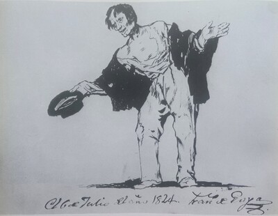 Esta obra posee un tono caricaturesco más acentuado que el otro dibujo que también se expuso en 1922 como propiedad del Marqués de la Scala: Mendigo tendiendo su sombrero. Tienen las mismas medidas y una factura similar y, como aquel, fechado en el verano de 1824, Gassier lo considera un croquis rápido, posiblemente realizado para obsequio de algún amigo en Francia pues, por aquellas fechas, el pintor se encontraba ya en París.