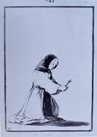 Este dibujo fue sacado a subasta en el Hôtel Drouot de París el 3 de abril de 1877 por 21 francos, bajo el título Le repentir (nº 39), pero no adjudicado. Se perdió su pista, junto con la de los dibujos El alguacil Lampiños cosido dentro de un caballo vivo (F.85), del mismo Cuaderno F, y Bajan riñendo (D.j), del Cuaderno D, hasta que los tres, procedentes de una colección suiza, afloraron en una subasta celebrada en Christie’s Londres el 8 de julio de 2008. Este dibujo en particular fue adquirido por el magnate naviero griego Gregory Callimanopulos. Con su reaparición pudo identificarse fehacientemente como el F.47, pues antes, cuando estaba perdido, se clasificaba provisionalmente como el F.c.