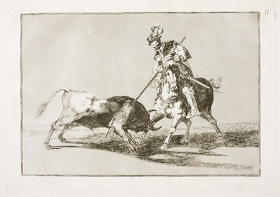 Primer dibujo preparatorio de la estampa El Cid Campeador lanceando otro toro. Destaca ante todo el realismo de la pica en este primer dibujo preparatorio para lo que luego será el grabado. Las posiciones del caballo y del toro son ajustadas y de una calidad plástica sorprendente. El gesto de sorpresa del caballo queda perfectamente plasmado, pudiéndose percibir perfectamente su reacción en ese momento del combate.