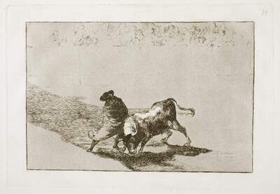 La luz resulta algo distinta a la de la estampa, teniendo en cuenta que aquí la esquina inferior izquierda de la escena está oscurecida y en el grabado Goya aclarará tanto la pierna que tiene adelantada el protagonista, como la parte superior del toro.