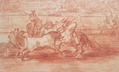 De la presente estampa existe un dibujo preparatorio, titulado también El esforzado Rendón picando un toro, de cuya suerte murió en la plaza de Madrid.