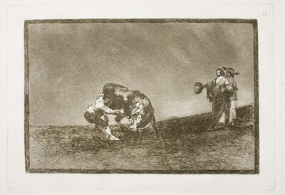 Dibujo preparatorio de la estampa El mismo vuelca un toro en la plaza de Madrid. Presenta elementos que luego Goya no introducirá en el grabado final. Salvo el grupo principal, formado por Martincho y el toro, el resto de la composición se transformará casi por completo al pasarla al grabado. De hecho, de todos los personajes secundarios que se ven en el dibujo, solo se conservará en la estampa la pareja de la derecha.