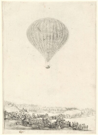 Félix Boix, en la conferencia que pronunció el 9 de julio de 1922 con motivo de la exposición de dibujos organizada por la Sociedad Española de Amigos del Arte, aludió a la que entonces se consideraba la primera ascensión aerostática en España, en realidad en Madrid (pues hubo otra antes en Aranjuez el 5 de junio de 1784), que tuvo lugar en los madrileños jardines del Buen Retiro el 12 de agosto de 1792, realizada por el capitán Lunardi, famoso aeronauta. Dicha hazaña fue plasmada por el pintor Antonio Carnicero, cuyo lienzo se conserva en el Museo del Prado. La segunda ascensión de Lunardi se realizó el 8 de enero de 1793, seguramente en la localidad madrileña de Aranjuez. Probablemente la primera ascensión de Lunardi inspiró a Goya para la realización de este dibujo a pluma y del otro realizado a lápiz, puesto que la segunda no la pudo ver pues para entonces había caído gravemente enfermo y se encontraba en Andalucía. Boix hace alusión al movimiento de las pequeñas figuras asegurando que el hombre que saluda ondeando una bandera desde la barquilla del globo es el mismo Lunardi. A la izquierda de la composición se observa el lugar desde donde se ha elevado el globo y a la derecha algunas pequeñas casas.