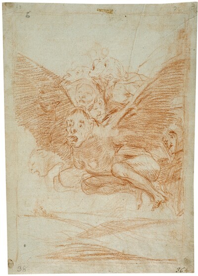 Esté en el reverso del dibujo preparatorio del Capricho 64, titulado Buen viage (dibujo preparatorio), cuya composición nada tiene que ver con este croquis.