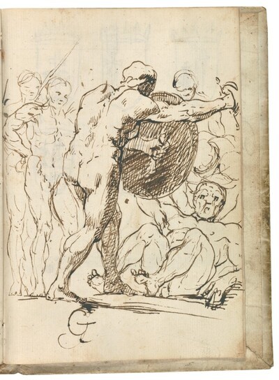 Escena con figuras masculinas desnudas a la manera clásica que, por su estilo y técnica y su idea de competición, se relaciona claramente con la de la página siguiente del Cuaderno italiano. Dibujada a pluma con trazo firme, seguro y sintético, parece representar una competición artística de carácter académico e inspiración clásica que permite al artista desplegar un completo estudio anatómico, con especial énfasis en la representación de la musculatura de los personajes, una preocupación que se repite a lo largo del Cuaderno italiano.