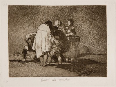Con gran precisión Goya ha realizado el dibujo preparatorio para la estampa nº 53, Espiró sin remedio. La primera diferencia que advertimos es que el dibujo es netamente más claro que el grabado, lo que se debe al empleo del aguatinta para el cielo y para el suelo con lo que consigue crear una atmósfera inquietante. Sin embargo las figuras que aparecen en el centro del dibujo no difieren de las de la estampa. La única divergencia consiste en que el pintor aragonés ha eliminado en el grabado algunas figuras bosquejadas superficialmente en el fondo, a la derecha del dibujo.