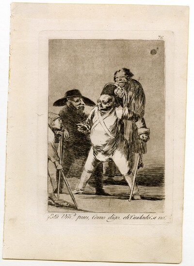 Existen diferencias notables entre el dibujo preparatorio y el grabado. Goya ha modificado este primer esbozo para obtener la escena burlesca que se plasma en el aguafuerte. En primer lugar, aparece un cuarto personaje en el extremo izquierdo, un mendigo apoyado en su muleta. Por otro lado, el testigo de la escena, en último plano, ha perdido el sombrero de tres picos, cambiando así de expresión. Y el personaje ubicado a la izquierda, aparece en el grabado cubierto con un sombrero de grandes alas. Todos estos elementos contribuyen a dar a la composición final de la estampa un equilibrio, una densidad en la repartición de las masas, que el simple dibujo preparatorio está lejos de poseer.
