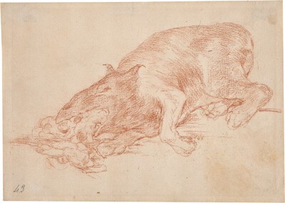 Esta bestia presenta fuertes analogías con la del grabado de nº 40, Algún partido saca en el que una mujer lucha ferozmente contra ella y le clava un cuchillo en el cuello, incluso se podría pensar que se trate de una continuación de aquel. El cadáver del animal podría ser una alegoría de la guerra que ha provocado muerte y desolación. De él emanan los frutos de todo ello, los cuerpos desnudos y quizá sin vida de las víctimas de la contienda. Esta gran anatomía apagada, casi putrefacta, sin esperanza o sin capacidad de regeneración, contrasta intensamente con el cuerpo de la Verdad a punto de resucitar del grabado nº 80, Si resucitará?, pleno de luz.