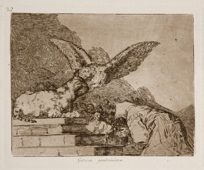 El dibujo preparatorio del grabado nº 73, Gatesca pantomima, de Los Desastres de la guerra presenta ciertas diferencias con respecto a la estampa. En él se puede ver al gato, no sobre unas escaleras como en el grabado, sino sobre una mesa o una tabla. Junto a él Goya ha pergeñado el búho que, en la estampa, vuela mientras que parece decirle algo al oído al gato. En el boceto, Goya ha preferido representarlo sobre un palo con las alas desplegadas. De esta manera el ave ocupa la posición central del grabado restando importancia al gato y al fraile que está en el ángulo inferior izquierdo, algo más hacia el fondo con respecto a la estampa.
