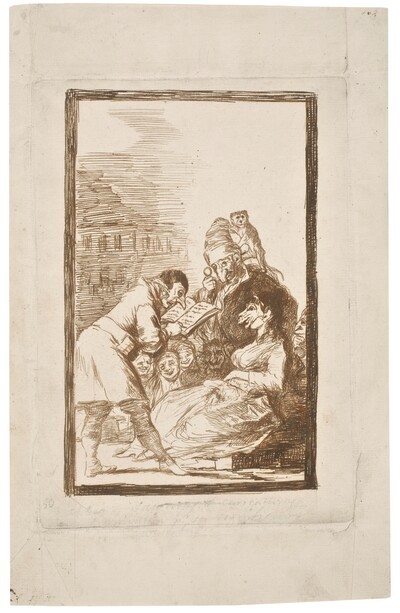 Reanuda la composición en esta aguada roja, reduciendo la multitud que asiste a la escena y suprimiendo el mono y toda la alusión sexual. El dibujo se recorta sobre una nueva plancha y, mediante importantes trabajos ejecutados directamente sobre el cobre, Goya llega al último estado de su expresión plástica.