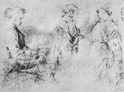 Existen dos dibujos preparatorios que muestran los bocetos del majo sentado fumando y el majo sentado. Había un tercero, hoy destruido, que mostraba a los tres personajes que quedan a la derecha de la composición.