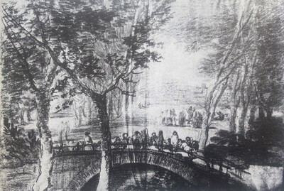 Forma pareja con el dibujo titulado El puente, que tiene medidas casi idénticas, refleja el mismo concepto del hombre empequeñecido por su entorno (aunque en su versión natural y de forma mucho más moderada) y ha pertenecido históricamente a la misma colección.