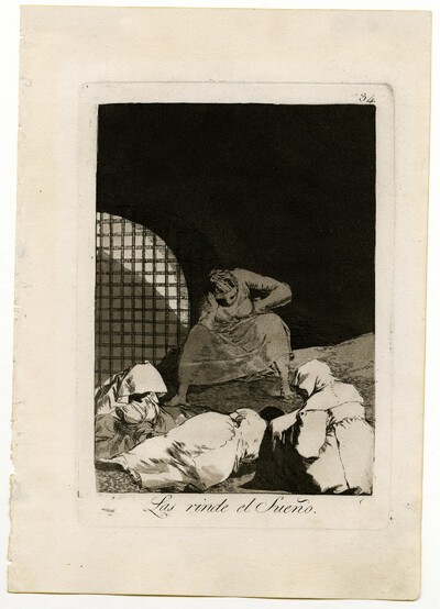 Este dibujo sirvió de preparación para el Capricho nº 34, Las rinde el Sueño. En el verso del folio advertimos algunos trazos de tinta china a pincel que representan una cabeza.