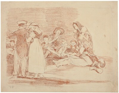 Goya continúa en este grabado con el tema del hambre que inició en la estampa nº 48, Cruel lástima. En medio de un descampado un grupo de personajes hambrientos piden ayuda a una joven que pasa junto a ellos agachando la cabeza. Al fondo un oficial francés la mira.