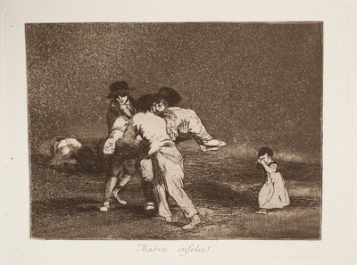 El dibujo preparatorio para el grabado Madre infeliz! es extremadamente preciso y está bien ejecutado. Con respecto a éste, no advertimos modificación alguna en la estampa. Simplemente el pintor ha empleado el aguatinta para oscurecer ostensiblemente el fondo y el suelo de la escena.