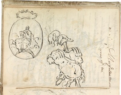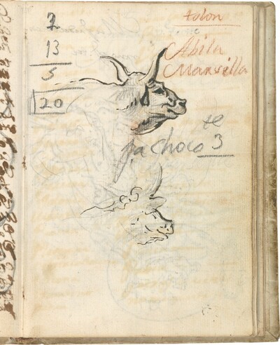 Como bien señalaron en su día Manuela Mena y Juliet Wilson-Bareau, debajo del monstruoso mascarón, en sentido transversal, se intuyen los ligeros trazos a la sanguina de un estudio preparatorio de las figuras de Aníbal y del genio para la composición del lienzo Aníbal vencedor, que por primera vez mira Italia desde los Alpes, que Goya envío en mayo de 1771 al concurso de la Accademia di Belle Arti di Parma. Dicho estudio presenta más paralelismos con el apunte de la página 43 del Cuaderno italiano que con el estudio preparatorio de la página 37 o la obra final, pues aunque aquí Aníbal, al igual que en la pintura definitiva, se toca ya la celada con la mano izquierda como oteando el horizonte, otros elementos, como el genio que acompaña al héroe señalándole el camino o la figura alegórica que porta una rueda, presentan todavía una disposición muy diferente a la final. Otros, como el gran caballo con el portaestandarte, ni siquiera aparecen aún. Por tanto, secuencialmente, según Manuel B. Mena, el presente dibujo sería posterior al apunte de la página 43 pero anterior al estudio de la 37. Goya debió de desecharlo pronto, lo que explicaría que hubiera dibujado encima sin ningún miramiento el monstruoso mascarón.